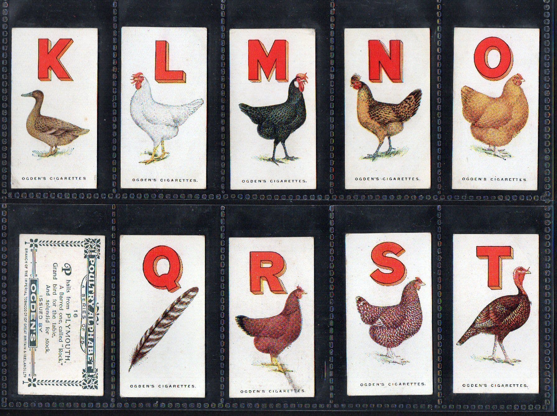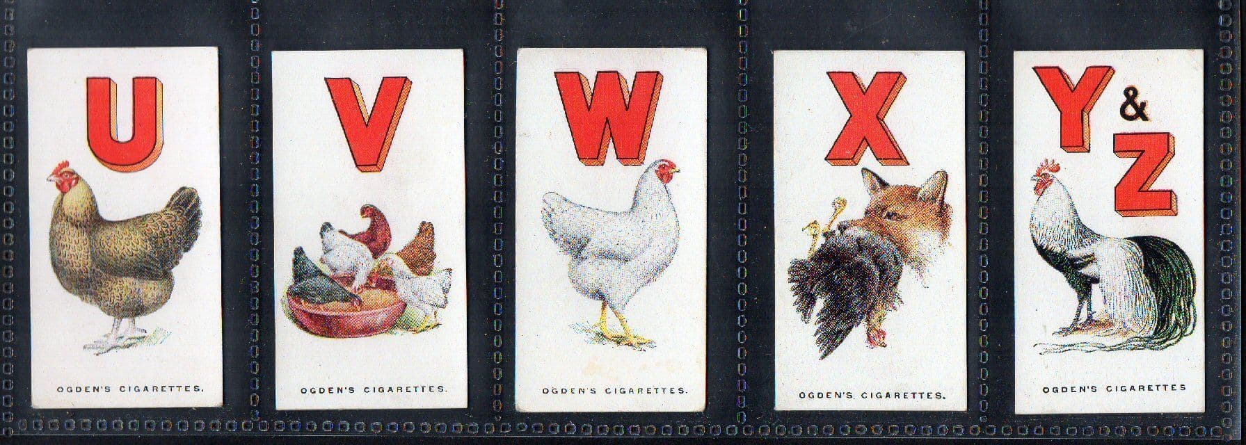 Cigarette cards set Chickens, Poultry Alphabet, 1925 Orpington, Bantam, Fox,