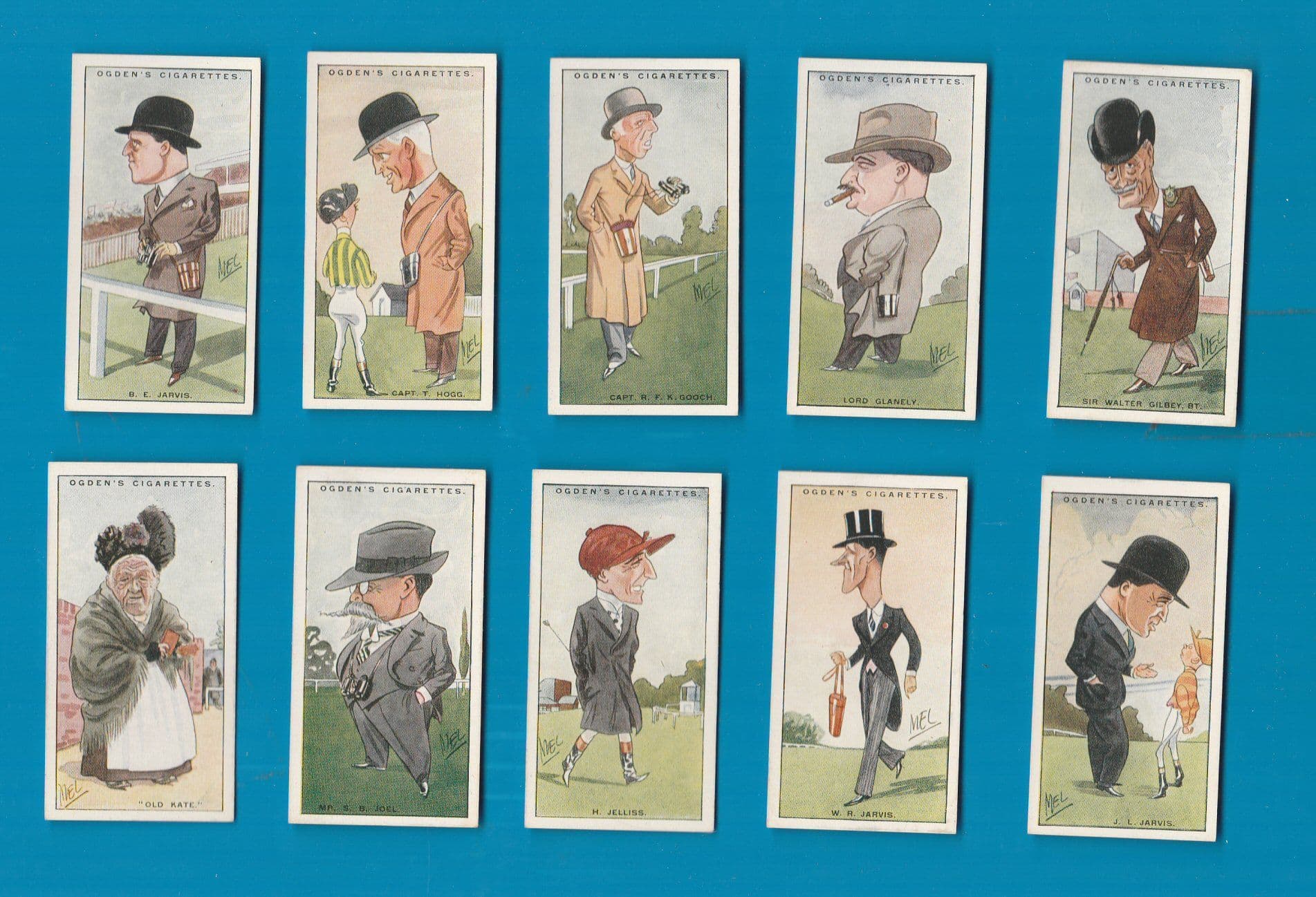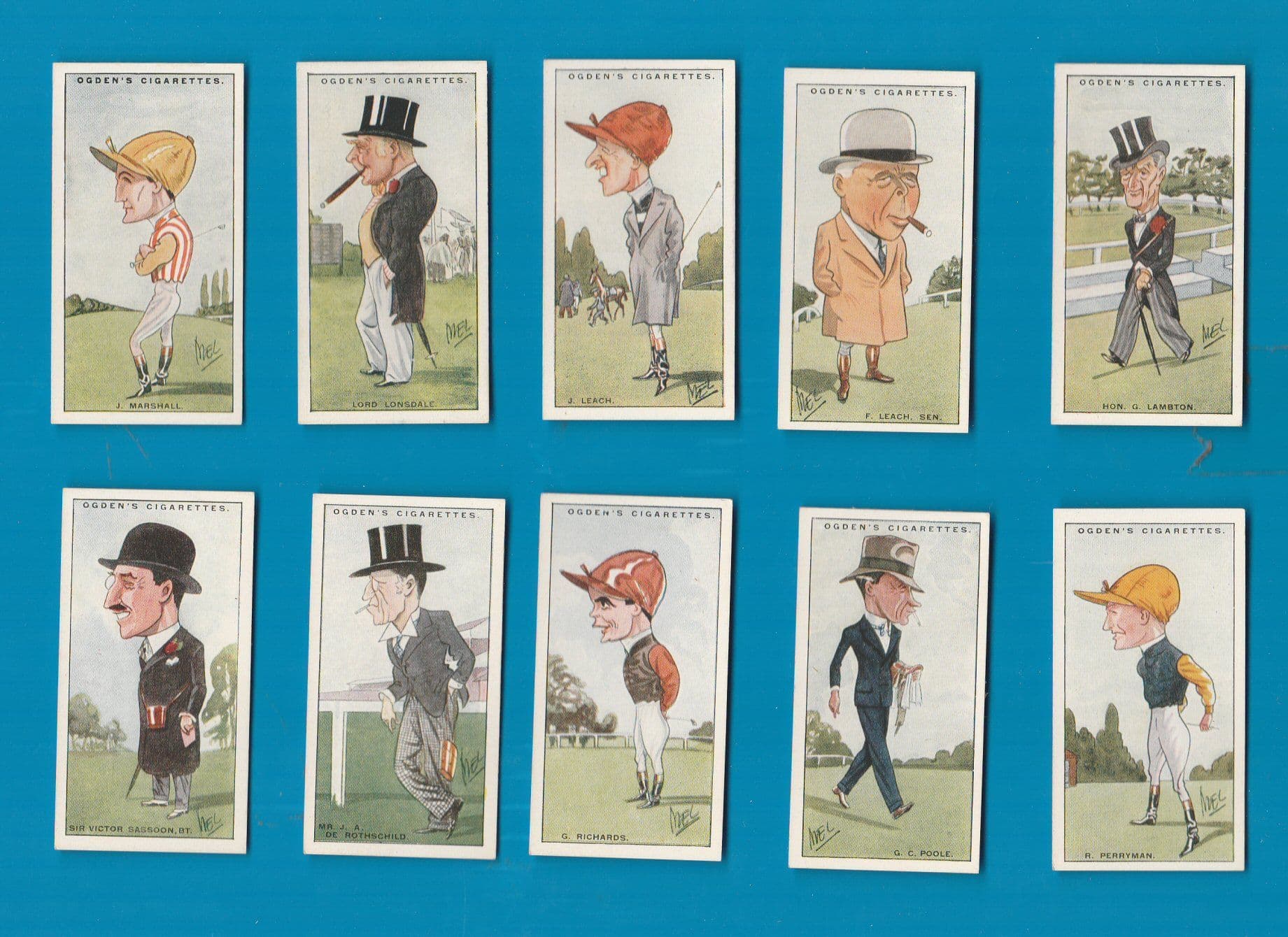 The cigarette cards in the set are :1 H.H. The Aga Khan, 2 Lord Astor,3 Sir Abe Bailey, 4 M. Beary, 5 H. Beasley,6 Mr. S. W. Beer, 7 Captain C. Boyd-Rochfort, 8 Sir George Bullough, 9 F. Butters,10 B. Carslake, 11 J. Childs, 12 Lord Dalmeny, 13 F. Darling, 14 S. H. Darling, 15 R. Day, 16 Lord Derby, 17 J. Dines, 18 S. Donoghue, 19 W. Earl, 20 E. C. Elliott, 21 Sir Walter Gilbey, 22 Lord Glanely, 23 Captain R. F. K. Gooch, 24 Captain T. Hogg, 25 B. E. Jarvis, 26 J. L. Jarvis, 27 W. R. Jarvis, 28 H. Jelliss, 29 Mr. S. B. Joel, 30 Old Kate, 31 Honourable George Lambton, 32 Felix Leach, 33 J. Leach, 34 Lord Lonsdale, 35 J. Marshall, 36 R. Perryman, 37 G. C. Poole, 38 G. Richards, 39 Mr. J. A. de Rothschild, 40 Sir Victor Sassoon, 41 J. Sirett, 42 C. Smirke, 43 Mr. S. Tattersall, 44 J. Thwaites, 45 Mr. J. Reid Walker, 46 J. Watts, 47 Lord Westmorland, 48 T. Weston, 49 Lt.-Col. C. W. S.hitburn , 50 Stanley Wootton