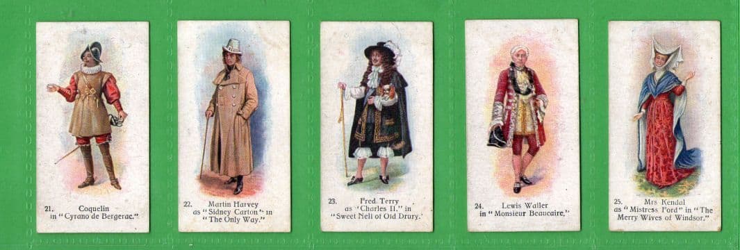 The cigarette cards in the set are : Sir Henry Irving in Faust,Sir Squire Bancrott in Caste,Mr John Lawrence Toole in Walker London,Sir George Alexander in The Prisoner of Zenda,Lady Bancroft in Masks and Faces,Sir Herbert Tree in Trilby,Sir J Forbes-Robertson in Mice and Men,Sir Charles, Wyndham,Cyril Maude in Beauty and the Barge,Miss Gertrude Elliott in Mice and Men,WS Penley in The Private Secretary,Sir John Hare A Pair of Spectacles,Miss Winifred Emery in Dick Sheridan,Miss Julia Neilson in Sweet Nell of Old Drury,Miss Gladys Cooper, in My Lady's Dress,Rutland Barrington in The Mikado,Henry Ainley in The Great Adventure,Dennis Eadie in Disraeli,Miss Ellen Terry in Faust,Gerald du Maurier in Raifles,Coquelin in Cyrano de Bergerac,Martin Harvey in The Only Way,Fred Terry in Sweet Nell, of Old Drury,Lewis Weller in Monsieur Beaucqire,Mrs Kendal in The Merry Wives of Windsor,